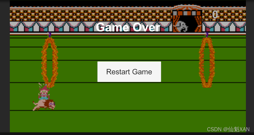 35、运行场景,就会自动生成场景,跳过火圈,加分,撞到火圈,游戏结束