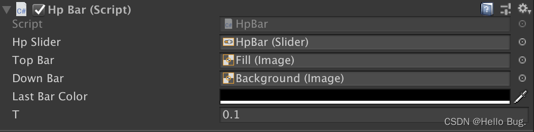 HpSlider:Slider组件 TopBar:顶部血条 DownBar:底部血条 LastBarColor:最后一条血条的颜色 T:血量改变时缓动的插值(如果不需要缓动效果则设置为1即可)