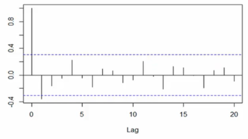 [?1,1],-1和1分别代表负相关和正相关,注意,正负相关都是相关,越接近0才代表越不相关。  虚线表示置信区间,举例,95%的置信区间表示,假设当前有100个数据,至少有95个是符合我们定义的逻辑。横轴lag表示阶数