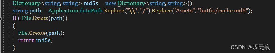 string path = Application.dataPath.Replace("\\", "/").Replace("Assets", "hotfix/cache.md5");