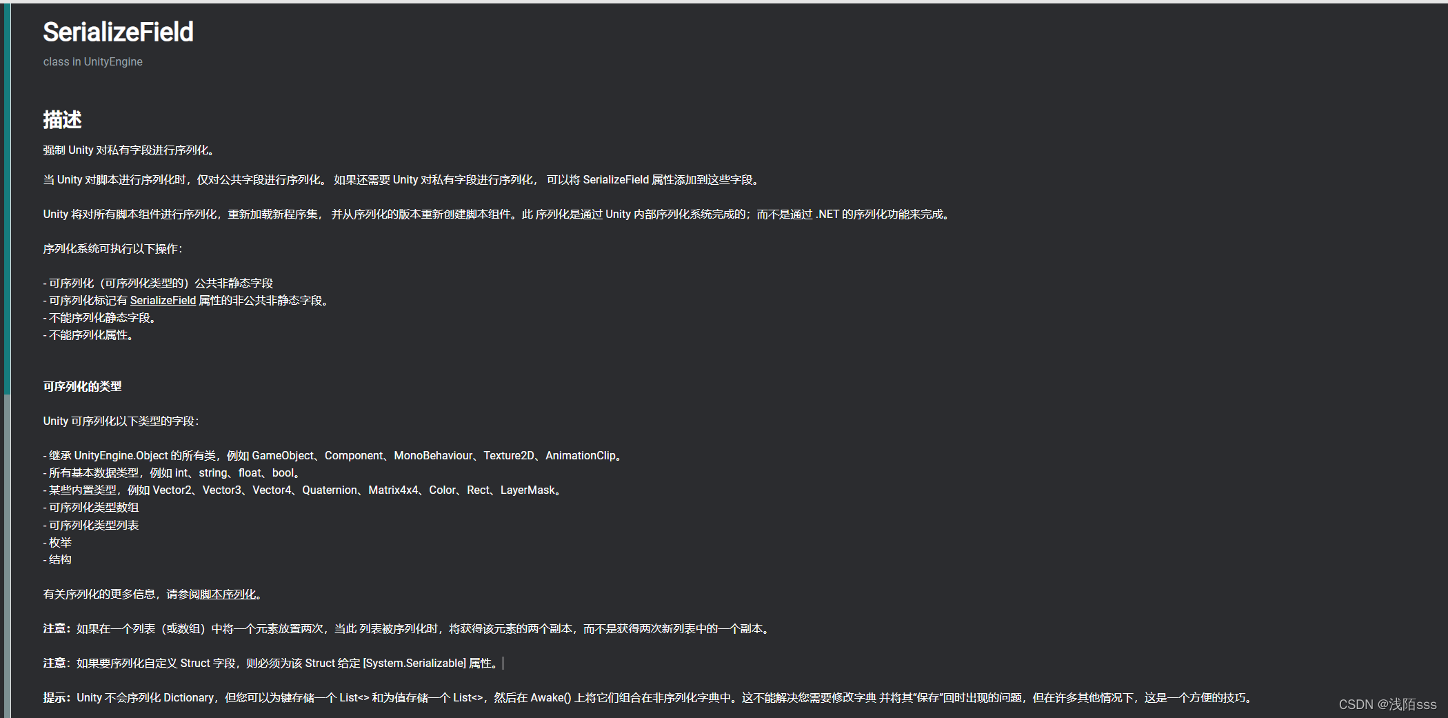 当 Unity 对脚本进行序列化时,仅对公共字段进行序列化。 如果还需要 Unity 对私有字段进行序列化, 可以将 SerializeField 属性添加到这些字段。 Unity 将对所有脚本组件进行序列化,重新加载新程序集, 并从序列化的版本重新创建脚本组件。此 序列化是通过 Unity 内部序列化系统完成的;而不是通过 .NET 的序列化功能来完成。