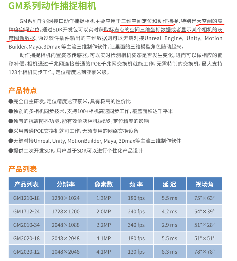 关于动作捕捉技术用到的相机就是动捕相机,像欧比邻·奥视得倍的GM系列动作捕捉相机,就适合应用于大空间高精度的定位工作,主要应用于三维空间定位和动作捕捉。(有需要的合作单位可以联系)以下是GM系列动作捕捉相机的产品特点和不同型号的产品参数。