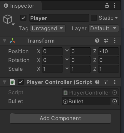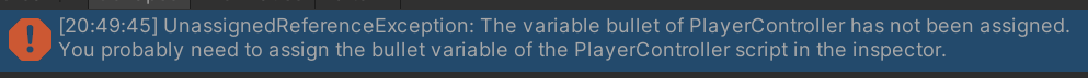 例如这里我们希望角色控制器(PlayerController)生成一枚子弹(Bullet),但是忘记向脚本挂在我们需要的子弹预制体。