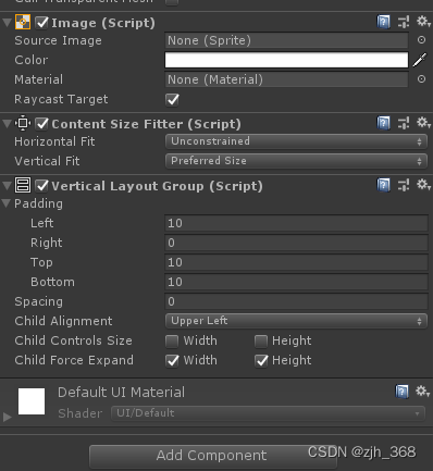 3、给Image对象也添加ContentSizeFitter组件,并增加VerticalLayoutGroup组件用于自动调节背景的大小。