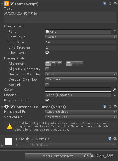 2、给Text对象添加ContentSizeFitter组件。用于设置水平或垂直内容的自动调整