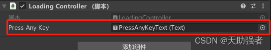 最后提示一下,脚本里定义了一个 Text PressAnyKey 属性,这个没有在代码里初始化。初始化的方式我采用的是在检查器里进行配置。
