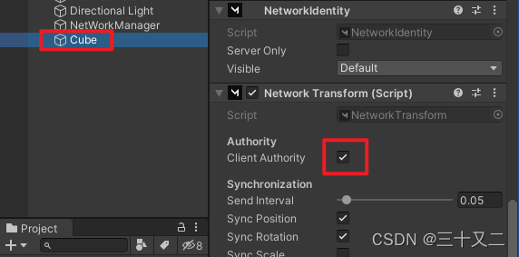 实践中:场景创建Cube添加NetworkTransform(自动添加NetworkIdentity)勾选ClientAuthority