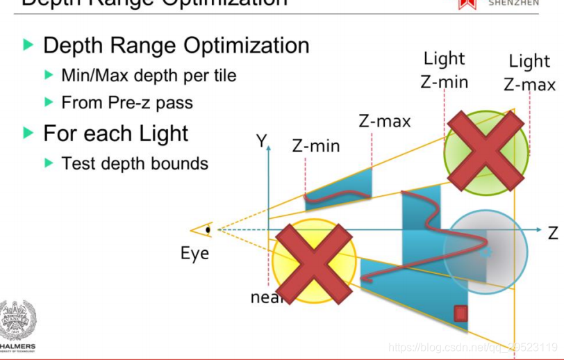 Tiled Based Cull的剔除灯光效率不错,但是效率有些依赖PreZ, 因为除了frustum cull 还得进行DepthRange的剔除优化,上面说了 没PreZ,?DepthRange的剔除优化是没了,效率进一步降低。如下所示: