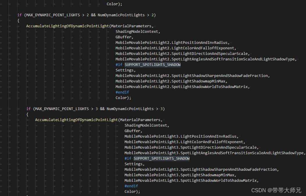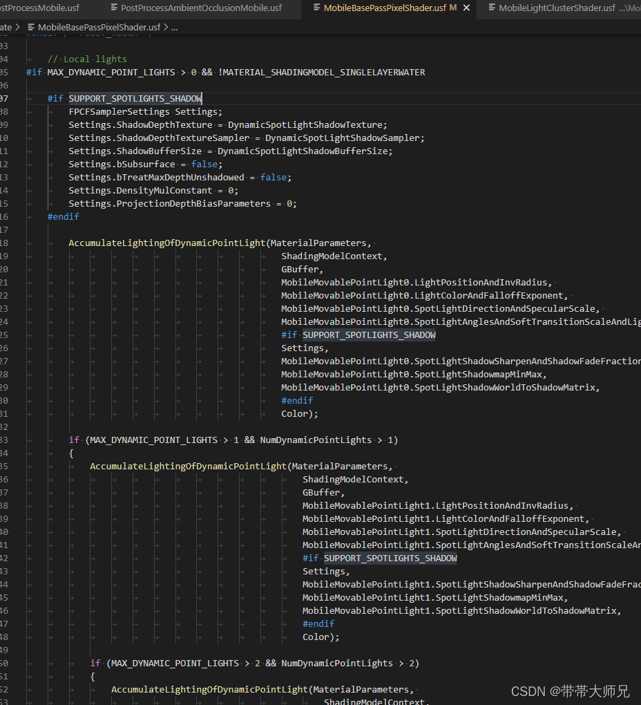 看下MobileBasePassPixelShader.usf的文件,你会发现是UE是“手动”多光源实现,硬编码最大4个点灯光。如下所示