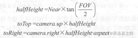 为了方便计算,我们可以先计算两个向量——toTop 和toRight,它们是起点位于近裁剪平面中心、分别指向摄像机正上方和正右方的向量。它们的计算公式如下: