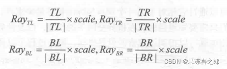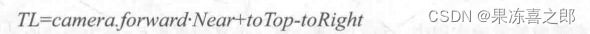 当得到这两个辅助向量后,我们就可以计算4个角相对于摄像机的方向了。我们以左上角为例,它的计算公式如下: