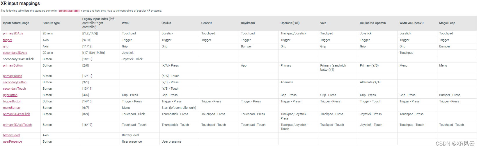 那如何使用呢?我们先看看Unity封装的各个按键的对应关系。已经支持了很多市面上的VR设备。主要还是Oculus。你可以去官网上进行参考:Unity - Manual: Unity XR Input