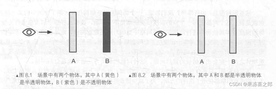 ?假设场景中有两个物体A和B,A半透明,B半透明。如上右图。