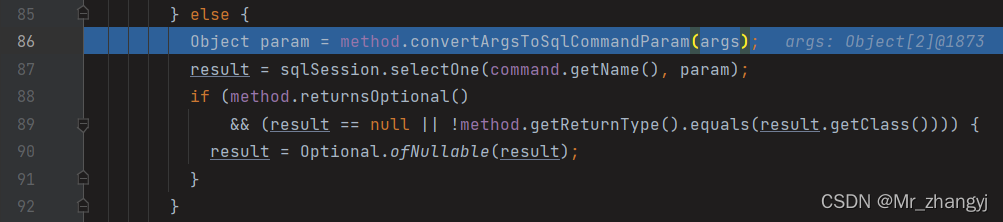 ?步入后跳转到?MapperMethod 类的?convertArgsToSqlCommandParam 方法,再次步入,跳转到 ParamNameResolver类 的 getNamedParams 方法。