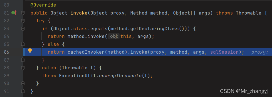 ?② 调试启动后,步入,跳转到 MapperProxy类 ,可见使用的是代理模式,下一步到下图该行后,步入 invoke 方法