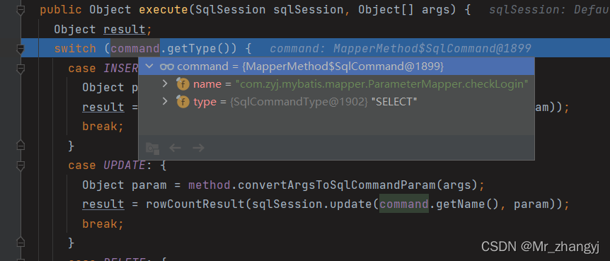 ?③ 一直步入到 MapperMethod 类的 execute 方法。可以看到执行 command 的 name 存放的是要执行的 SQL 语句,type 存放的是其类型,根据不用的 SQL 语句的类型会执行不同的方法