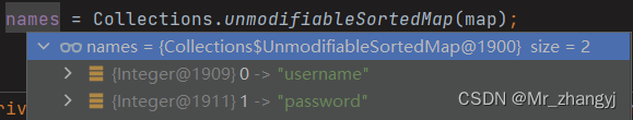 该方法首先获取了 names.size() 方法,而 names 的定义为?private final SortedMap<Integer, String> names; 且在该类的第90行被赋值为?names = Collections.unmodifiableSortedMap(map); 从而可知:getNamedParams 方法就是给 names 赋值的方法,部分注解如下: