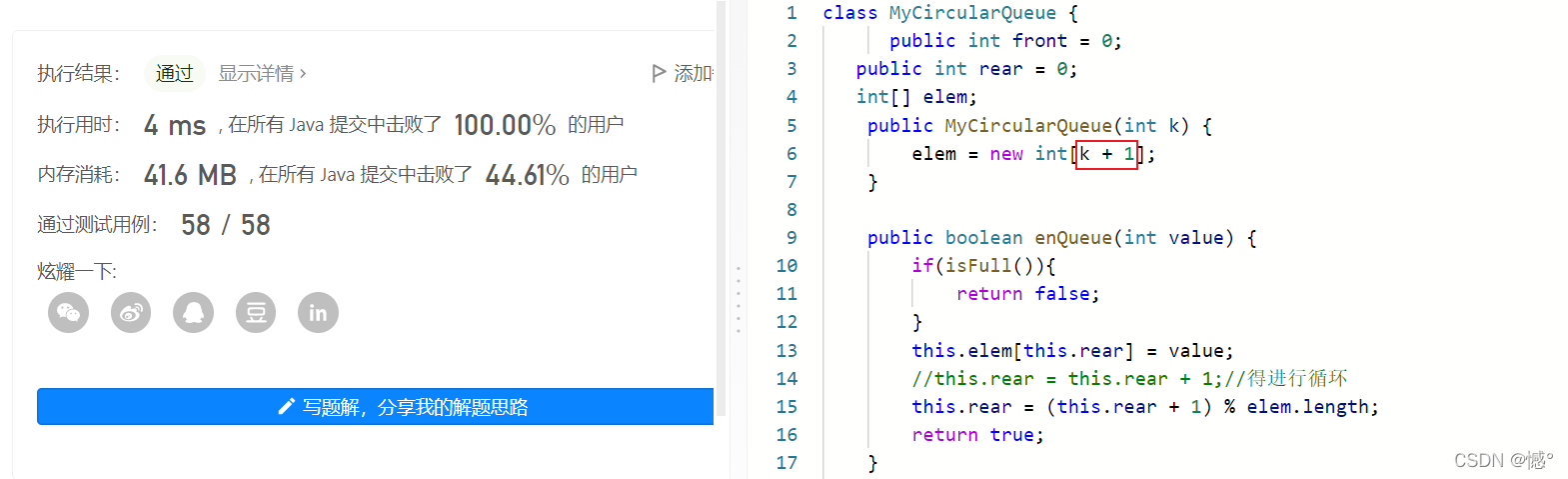 当时用循环队列去解题时,会发现代码无法通过,因为数组中的一个空间被用作区分队列是否为满了,因此在开辟数组空间时,需要k+1个长度的空间。