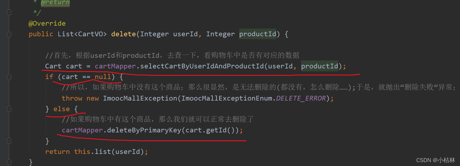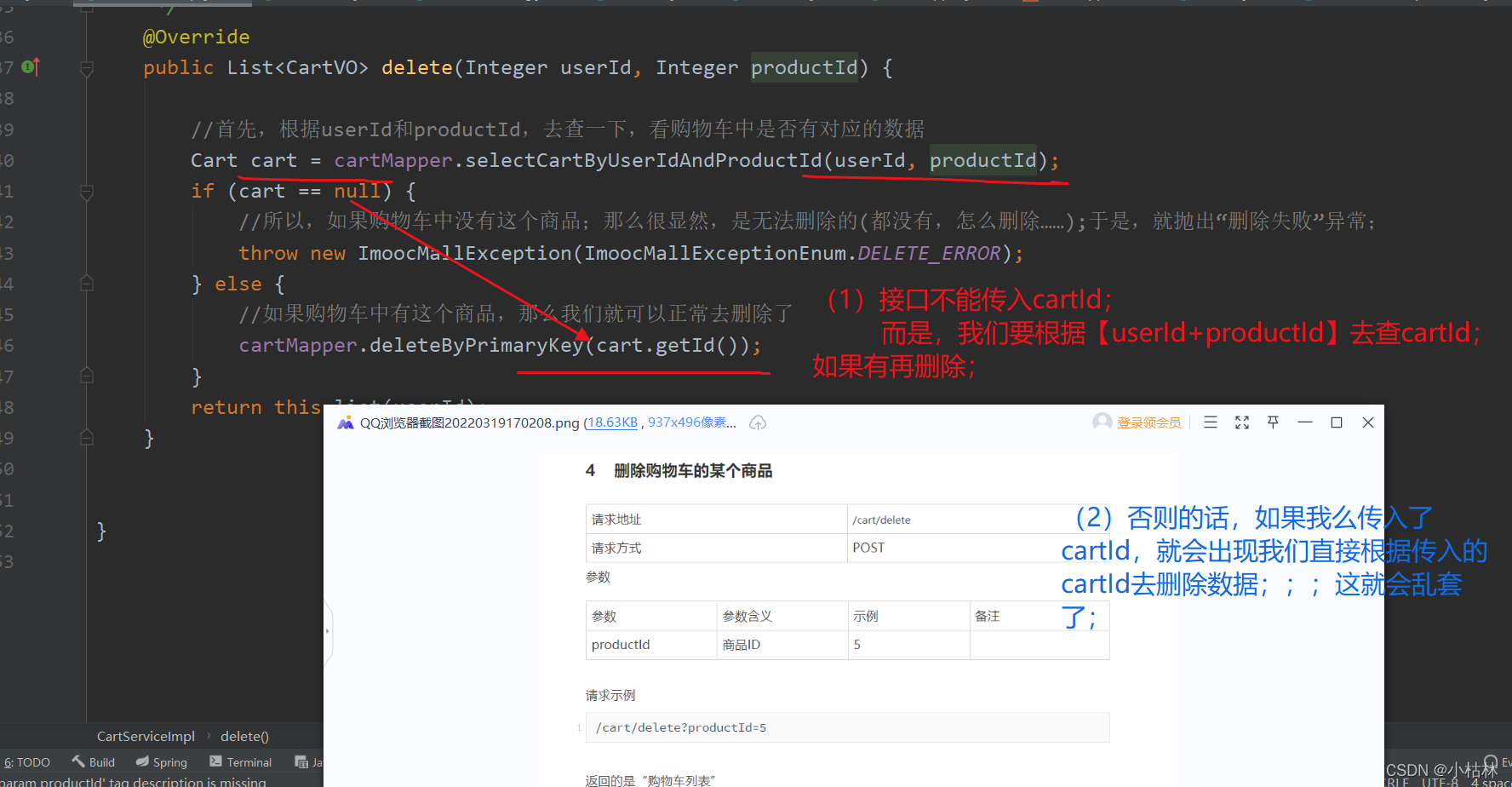 (1)删除的时候,需要先看下,根据【当前用户 +?productid】两个条件,看下购物车中,我们要删除的这个商品是否存在;如果存在就去删除,否则就抛出“删除失败”异常;