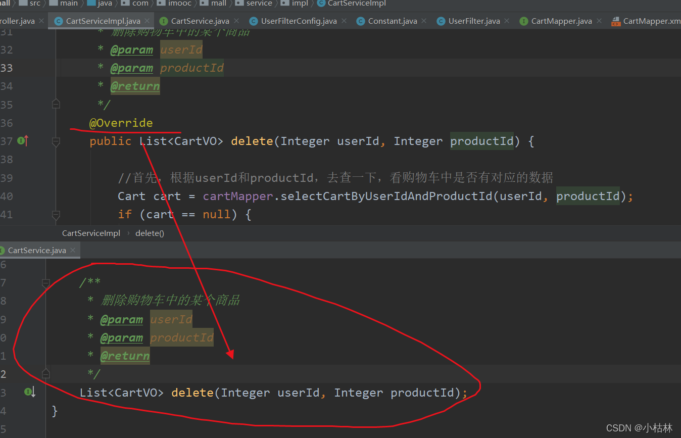 2.在CartServiceImpl中,创建删除购物车某个商品的方法delete()方法;并在CartService中,反向生成方法的声明;