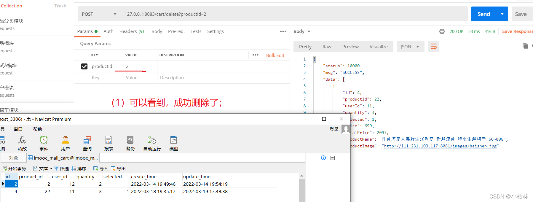 2.【删除购物车的某个商品】接口,在界面上的表现;