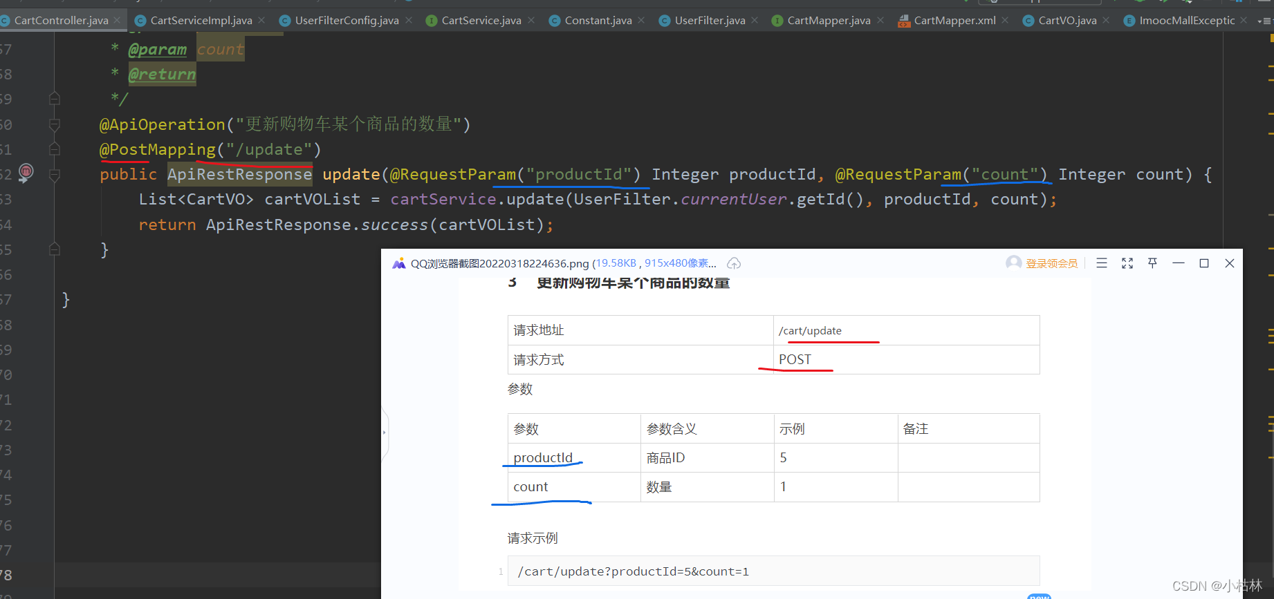 (3)service层的更新购物车某个商品的数量方法update()方法,在下一部分介绍;