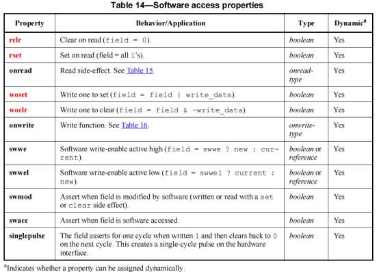 - SystemRDL可以描述软件访问方式,除了包含可读写RW、只读、只写外还有很多访问方式,如下图table 14
