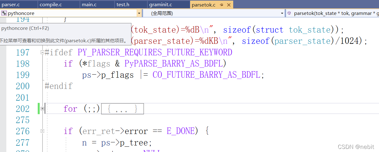 注意这个for循环,我思考了很久才发现,tok_state与parser_state似乎并没有特别的交集,但是,它们之间其实是通过一个char* str来产生联系的。