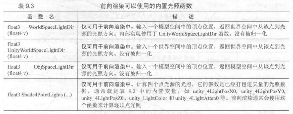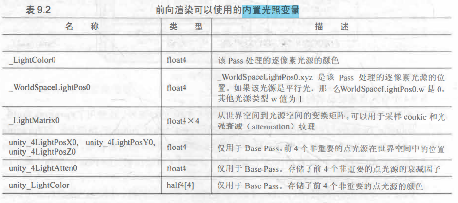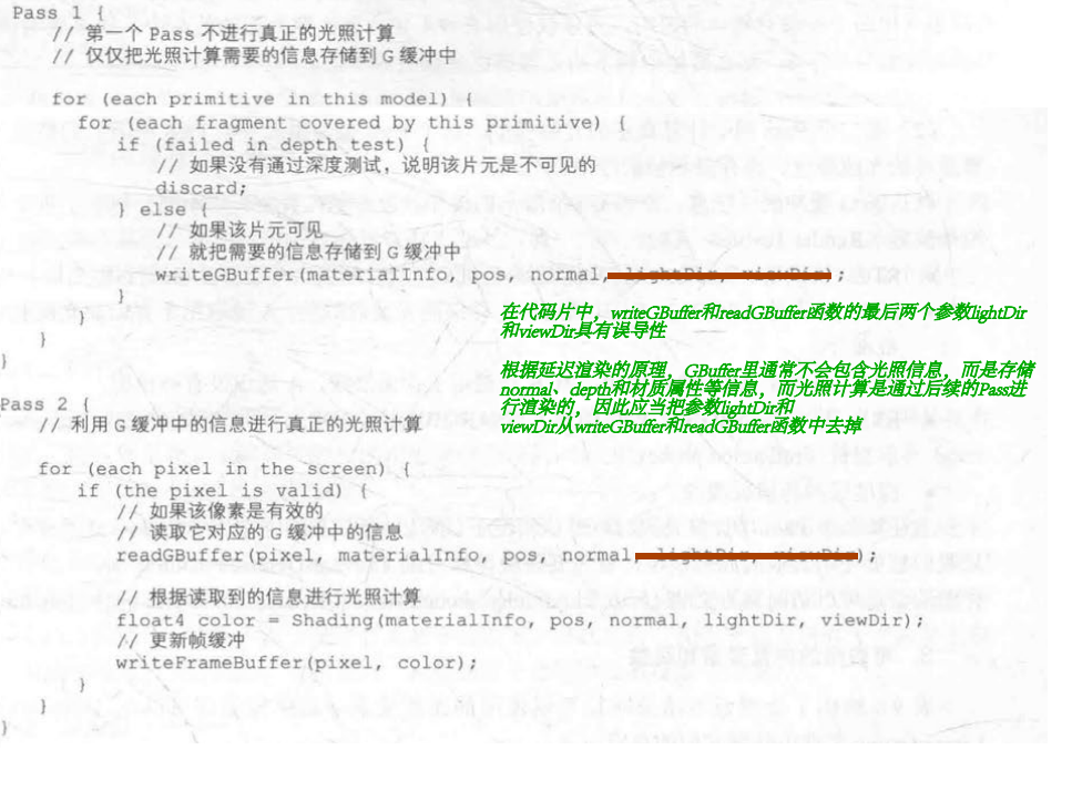 5、内置光照变量和函数   延迟渲染路径 链接 1、延迟渲染的效率不依赖于场景的复杂度,而是和我们使用的屏幕空间的大小有关;适合在场景中光源数目很多、如果使用前向渲染会造成性能瓶颈的情况下使用。 2、延迟渲染主要包含了两个 Pass : ??第一个Pass 用于渲染G缓冲 ??我们不进行任何光照计算,而是仅仅计算哪些片元是可见的,这主要是通过深度缓冲技术来实现,当发现一个片元是可见的,我们就把它的相关信息存储到G缓冲区中(物体的漫反射颜色、高光反射颜色、平滑度 、法线、 自发光和深度等信息) ??第二个Pass用于计算真正的光照模型 ??使用上一个Pass中渲染的数据来计算最终的光照颜色,再存储到帧缓冲中