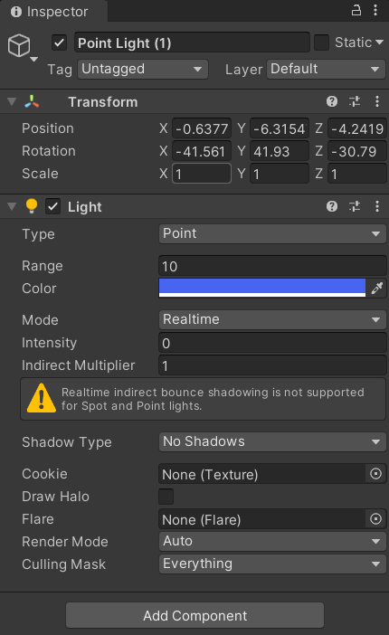 【多光源前向渲染】  Unity 处理这些点光源的顺序是按照它们的重要度排序的,和光源强度、颜色、距离物体的远近有关系 原顺序:  红色point light的intensity改为2:  把红光设置为not important unity不会把该光源当成逐像素处理,由于代码的Bass Pase 中没有计算逐顶点和 SH 光源,那么红光上不会对物体造成任何影响 (消失的小红)