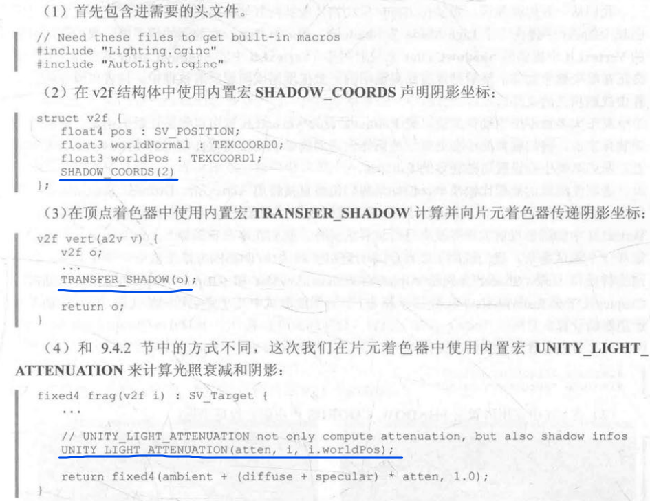 计算阴影中用到三个宏 输出结构体 v2f 中添加了一个内置宏 SHADOW_COORDS: 声明了 一个名为_ShadowCoord 的阴影纹理坐标变址 顶点着色器返回之前添加另一个内置宏 TRANSFER_SHADOW:调用内置的ComputeScreenPos函数来计算_ ShadowCoord 片元着色器中计算阴影值,同样使用了一个内置宏 SHADOW ATTENUATION: 使用 _ShadowCoord对相关的纹理进行采样