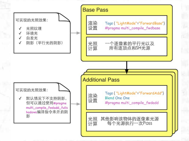 ? Base Pass ??环境光和自发光是在Base Pass中计算的。如果我们在AdditionalPass中计算这两种光照, 就会造成叠加多次环境光和自发光 ??渲染的平行光默认是支持阴影的(如果开启了光源的阴影功能) ? Additional Pass ??开启和设置了混合模式(一般是Blend One One)。 每个AdditionalPass可以与上一次的光照结果在帧缓存中进行叠加,否则会覆盖掉之前的渲染结果,看起来就好像该物体只受该光源的影响。 ??渲染的光源在默认情况下是没有阴影效果的, 即便我们在它的Light组件中设置了有阴影的Shadow Type。