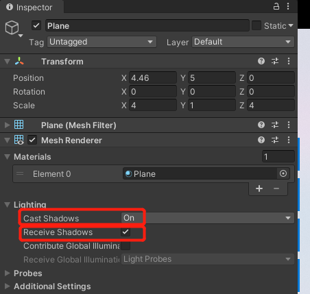 通过 Mesh Renderer 组件中的 Cast Shadows、Receive Shadows 属性设置某个物体投射或接收阴影