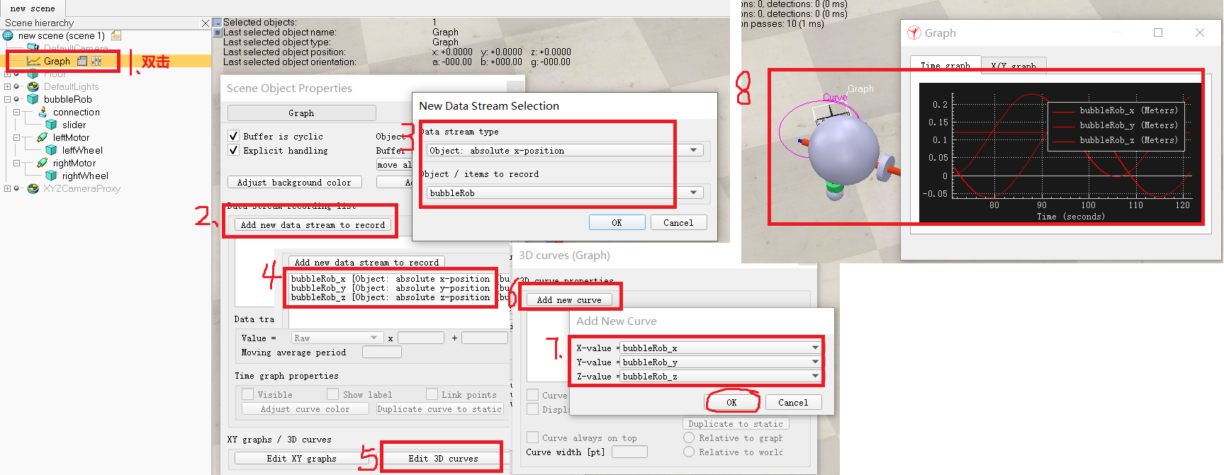 (1) 点击 add→Graph,添加图像窗口,设置其位置为(0,0,0.005);  (2) 4.2版本图像窗口无法直接编辑,依次打开文件C:\Program Files\CoppeliaRobotics\CoppeliaSimEdu\system,打开usrset.txt文件,查找showOldDlgs,将其改为true,保存,然后重新打开文件,就和之前的版本一样了;  (3) 双击层次结构中Graph图标,点击Add new data strem to record,分别添加bubbleRob的x,y,z位置,并修改数据名称为bubbleRob_x, bubbleRob_y, bubbleRob_z,然后点击Edit 3D curves,Add new curve, x, y, z-Value 分别选为 bubbleRob_x, bubbleRob_y, bubbleRob_z, 点击ok。然后重新运行仿真,可以看到视图中可以看到小车运行轨迹,其x,y,z值在图像窗口中显示。