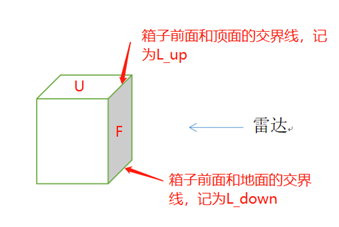 二、雷达标定 以上需要用到软件的准备工作结束,进入雷达标定。 1.将雷达水平放置,根据点云图,将雷达Y轴方向与车正前方统一,水平转角尽可能接近于0; 2.调整垂直方向,一般车顶雷达水平或稍微向下倾斜(1°2°,可用手机或更精密的一起测得),车前雷达向下倾斜角度稍大(5°10°)。通过点云图可以看盲区范围,盲区范围尽可能调小,但要保证车前雷达打的最远的线和车顶雷达打的最近的线有重合部分,否则两雷达检测范围中间会有盲区 3.将纸箱均匀的摆放在车前,左、右、中间、前、后都要顾及到,一般的范围是靠近车辆的第一根先~20m/30m的范围,具体根据雷达的位置而定。  4.根据RSVIEW软件点云图调整纸箱位置,尽量保证不同距离的雷达扫描线都能打到纸箱上,并且要确保雷达线打在下图中的L_up或者L_down上,可以通过调整纸箱至刚好检测到有障碍的位置来实现。由于这两条线上有箱子的角点,便于车提坐标系下测量其坐标。 L_up的寻找:可通过看前视图和俯视图寻找。打到F面上的雷达线在雷达坐标系下,y值相同,z值不同,打到U面上的雷达线y值不同,z值相同,以此来寻找临界线,当箱子往前(靠近车的方向)推时,线会打到U面上,导致z值不变,y值增大,当箱子往后(远离车的方向)推时,线会打到F面上,导致改线的z值减小,y值不变。 L_down的寻找:打到箱子上的线和地面线重合,两者z值相差不大,利用反射率区分箱子和地面。  5.按照4中提到的方法,将箱子一个一个调整好位置,每调整好一个箱子,就应该用胶带在地面上贴出箱子的位置,以防箱子被风吹或者不小心移动后可以将其放置到原位置,并在顶层标注好箱子的标号,在记录本上画出箱子的相对位置和找出的角点。理论上来说,找出4个点已经足够解方程,但容易带来很大的误差,所以我们尽量多选取点,最后用回归的方法解出转换矩阵A(有程序支持),一般记录16个以上的点. 6.当所有的箱子摆好后,需要让人远离标定场地,只剩下箱子,用RSview记录一段此时的点云数据并保存至离线数据。 7.惯导的位置在地面的投影位于两个后轮胎连线的重点,用卷尺拉在两个轮胎中间并延长,用宽胶带贴出两个轮胎的位置,并根据卷尺的度数,标出中点的位置,前轮胎做同样的操作。连接前后轮标记出的两个中点为车体坐标的Y轴,后轮胎为车体坐标的X轴,以此为原点,用卷尺测量并记录每个箱子所选中角点在车体坐标下的(x,y,z)值,注意,位于Y轴左侧的箱子,角点的X值应为负值。  8.(1)在实时显示数据时点击Record按钮。  (2)在弹出的ChooseOutputFile对话框中,选择需要保存的路径和保存的文件名后,点击“保存(S)”按钮。RSView将开始将数据包文件写入目标pcap文件中。(注意:RS-LiDAR-16将会产生大量的数据,随着记录时间变长,目标pcap文件将会变大。因此最好将记录文件保存到HDD或者SSD中,而不是保存到较慢的USB设备或者用网络保存)。  (3)再次点击Record按钮停止保存pcap数据