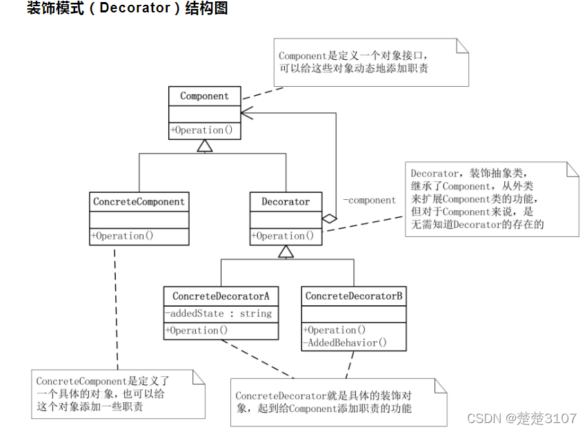 Decorator,装饰抽象类,继承了Component。从外类来扩展Component类的功能。对于Component来说,是无需知道Decorator的存在的。ConreteDecorator就是具体的装饰对象。起到给Component添加职责的功能。