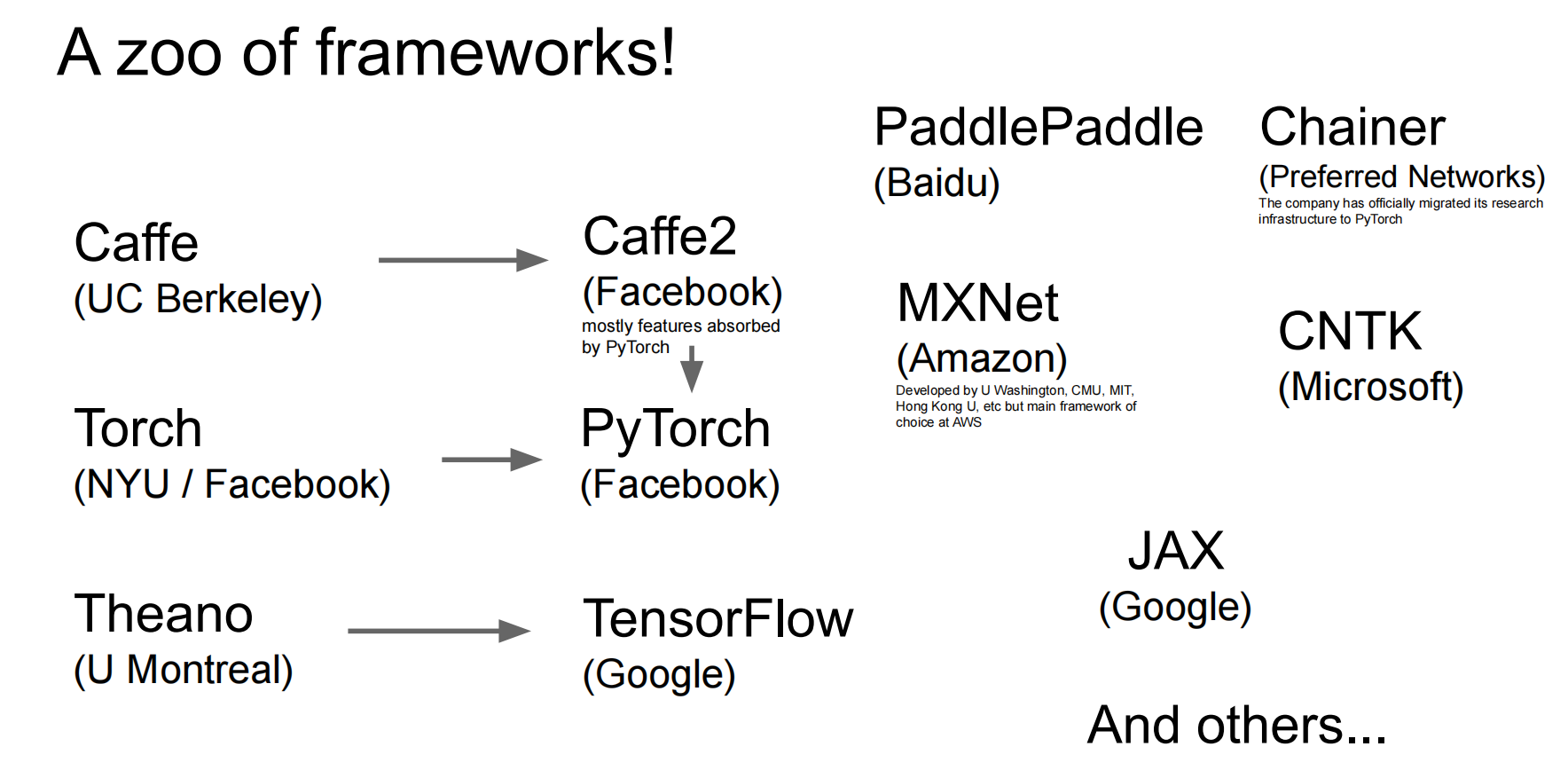 CPU:central processing unit CPU核心少,每一个核心更快,且更能干,更擅长顺序计算 GPU:graphic processing unit GPU有更多的核心,每个核心更慢,且笨,更擅长并行任务 TPU:为深度学习专有的硬件 programming on GPUS CUDA: (1)可直接在GPU运行类似C的代码, (2)优化的API有:cuBLAS,cuFFT,cuDNN,etc (3)仅限于英伟达 OpenCL: (1)类似于CUDA,但可以运行在任何事情上 (2)英伟达硬件上通常更慢 HIP: (1)可以将运行在CUDA的代码转化为运行在AMD,GPU的代码