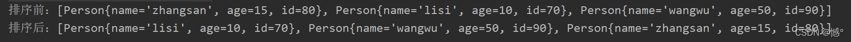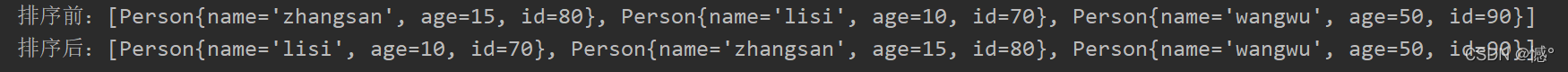 ?结果:此时我们就能实现对自定义对象的排序了,但是该方法对类的侵入性较强,也就是当我们想要使用以id大小作为排序方式时,我们就要修改compareTo()方法,那之前按照age排序的数组也将会被改为id进行排序,这就不是我们想要的结果了。我们是希望可以同时使用id或者age排序,而不是其中一种。此时我们就可以使用Comparator接口来进行操作了。
