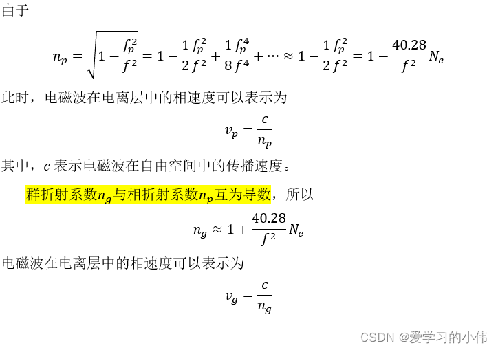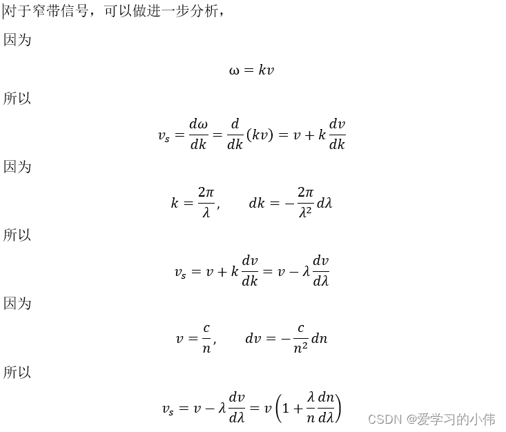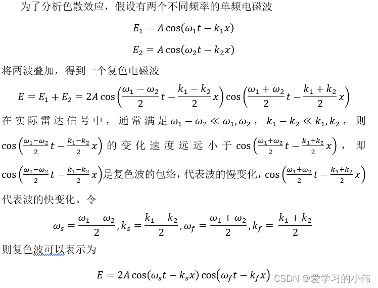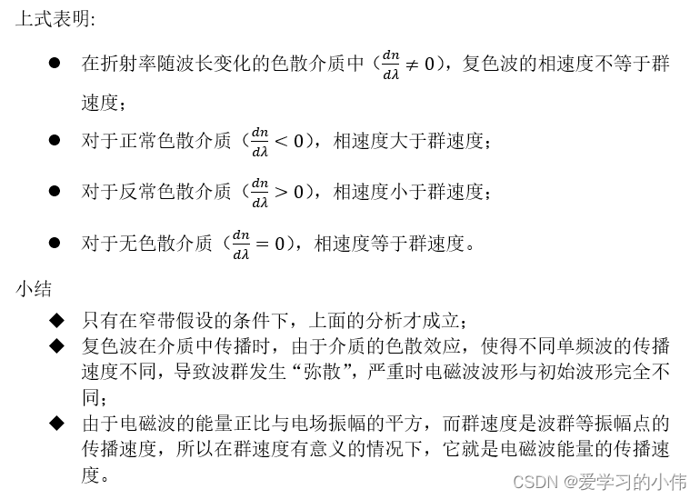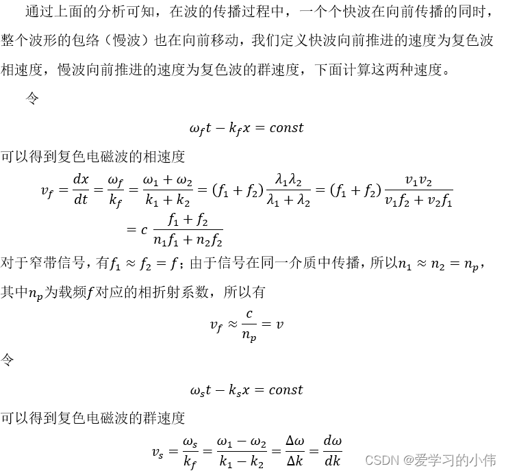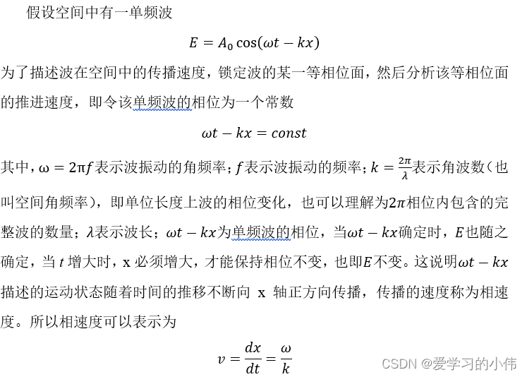 上面的表达式就是我们平时所说的电磁波在介质中传播的速度。根据普通物理学的知识,单频波的相速度又可以表示为