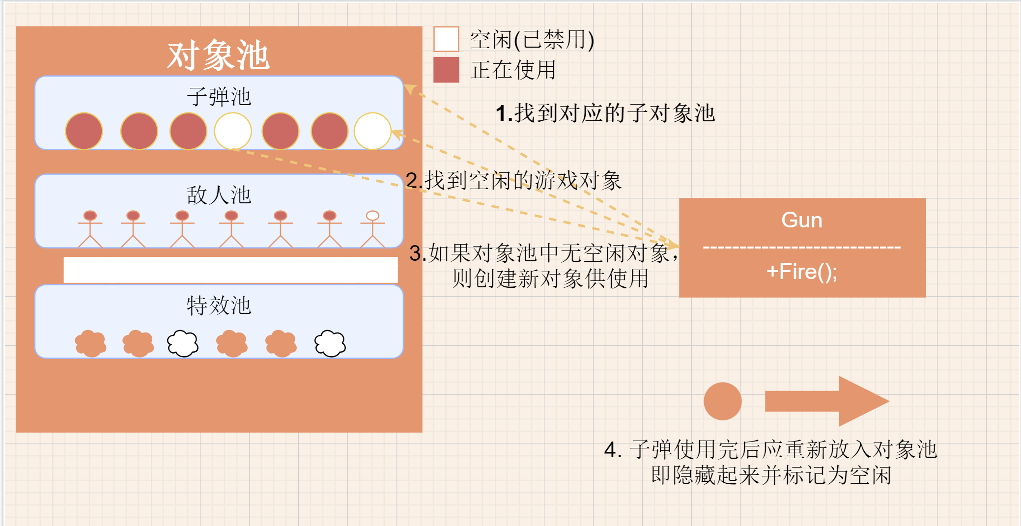 - 每个独立的池子中保存着若干个游戏对象供使用