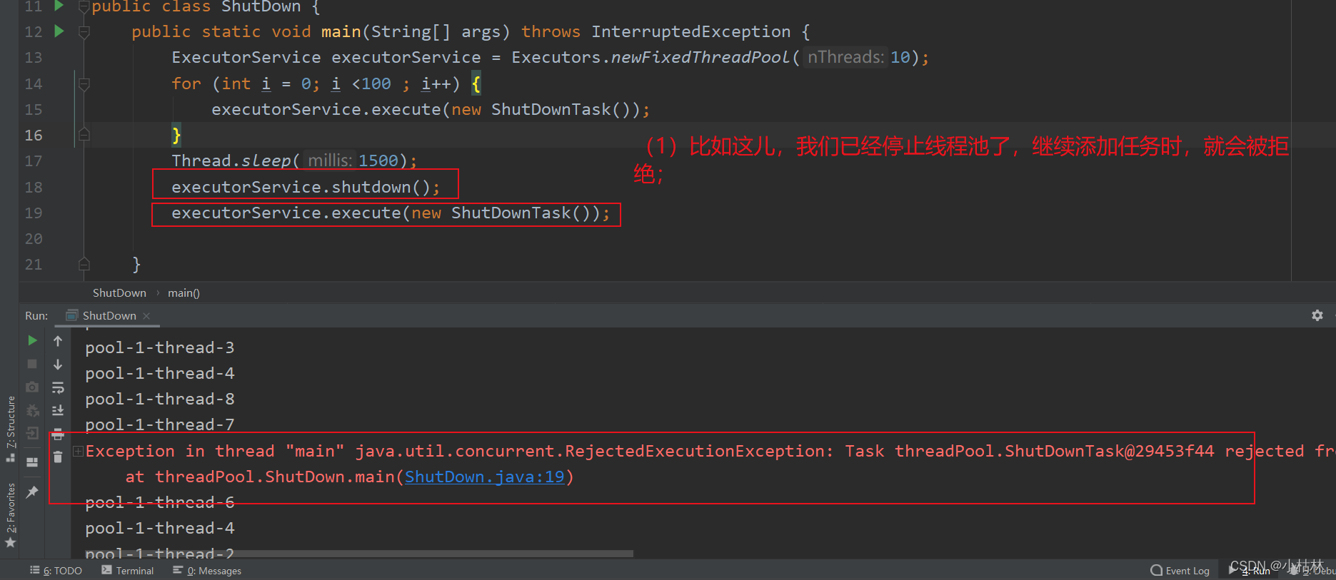 (1)当线程池关闭后,新来的任务就会被拒绝;
