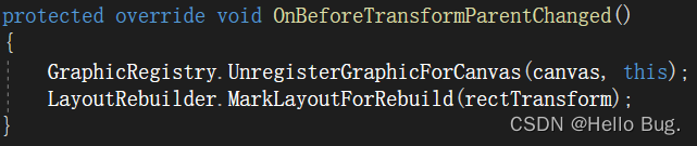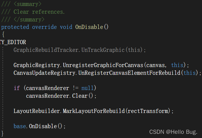 首先从GraphicRegistry和CanvasUpdateRegistry中将当前元素移除注册并清理canvasRenderer,最后通过LayoutRebuilder.MarkLayoutForRebuild方法将元素添加到布局重建序列中(因为Graphic已经Disable所以不需要将元素添加到图像重建序列中)