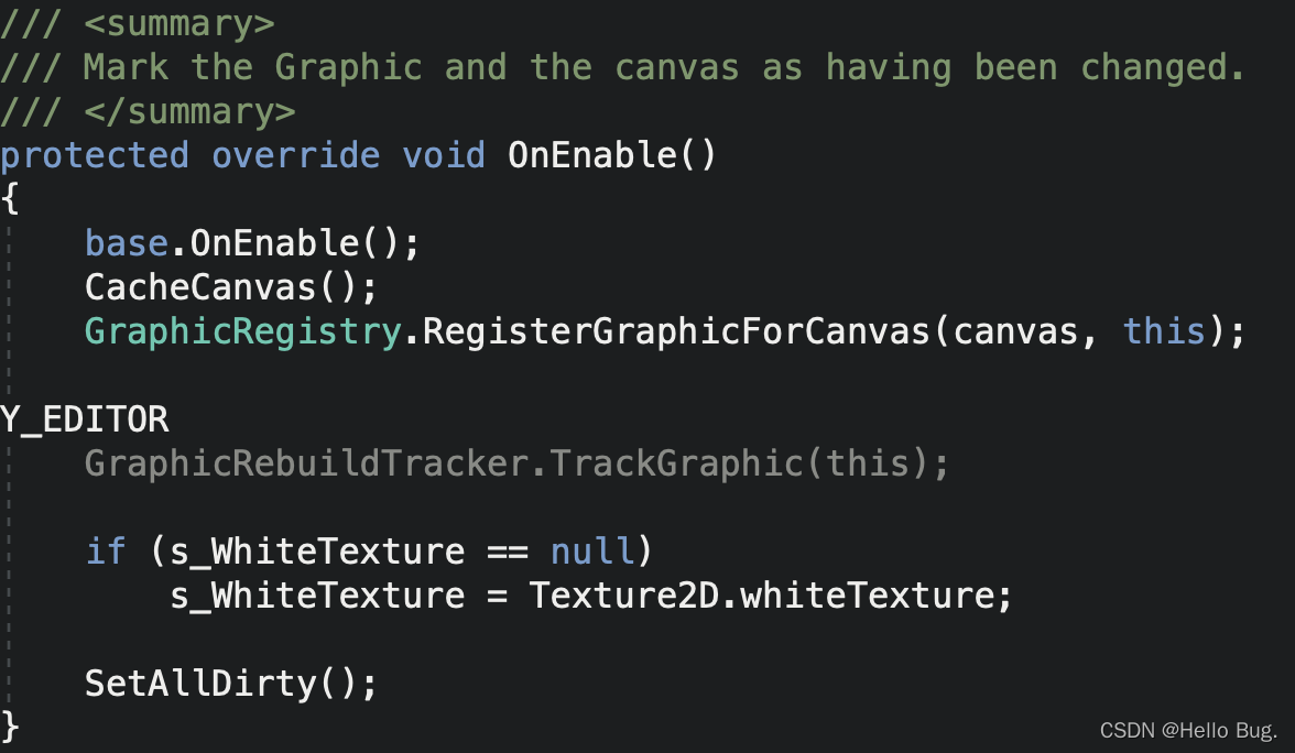 首先调用CacheCanvas方法找到渲染当前元素的Canvas,之后调用GraphicRegistry.RegisterGraphicForCanvas方法将此元素注册到m_Graphics字典中(每个Canvas对应了一个Graphic序列),最后使用SetAllDirty将元素添加到图像和布局重建序列中