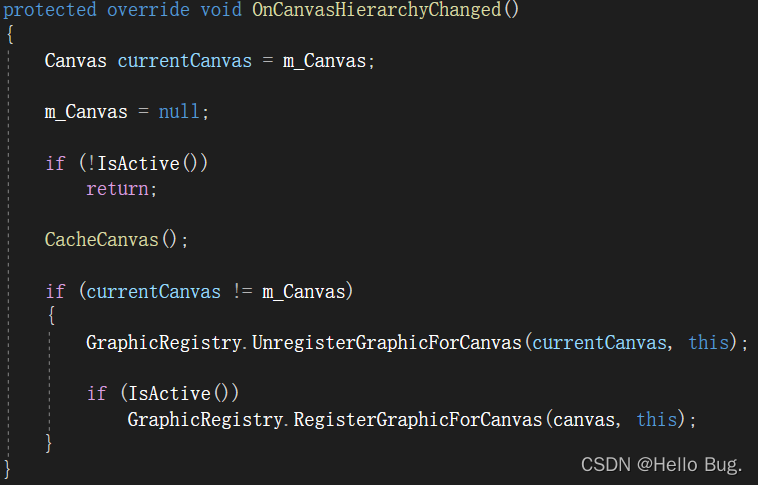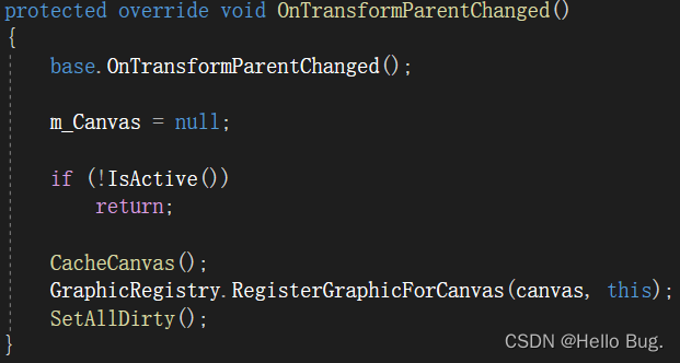 首先调用CacheCanvas方法找到渲染当前元素的Canvas,如果此canvas与缓存的canvas不同则移除之前注册的canvas并调用GraphicRegistry.RegisterGraphicForCanvas方法重新将此元素注册到m_Graphics字典中(每个Canvas对应了一个Graphic序列)