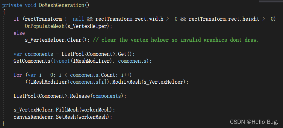 UpdateGeometry方法中首先调用了OnPopulateMesh方法将元素的顶点、颜色、UV等信息暂存到m_VertexHelper中,Graphic类中的OnPopulateMesh绘制了一个矩形,我们可以在自己的UI类中,重写OnPopulateMesh方法,实现自定义的UI 接着遍历身上继承了IMeshModifier的组件去调用ModifyMesh方法(一般是实现网格的一些特效,例如Shadow、Outline),更新m_VertexHelper数据 然后调用s_VertexHelper.FillMesh(workerMesh)将暂存的数据填入workMesh中 最后调用canvasRenderer.SetMesh(workerMesh)将workerMesh赋值给canvasRenderer,这样下一帧canvasRenderer渲染时就会用workerMesh的数据进行绘制了(SetMesh方法最终在C++中实现,这也是UGUI的效率比NGUI高一些的原因,因为NGUI的Mesh合并是在C#中完成)