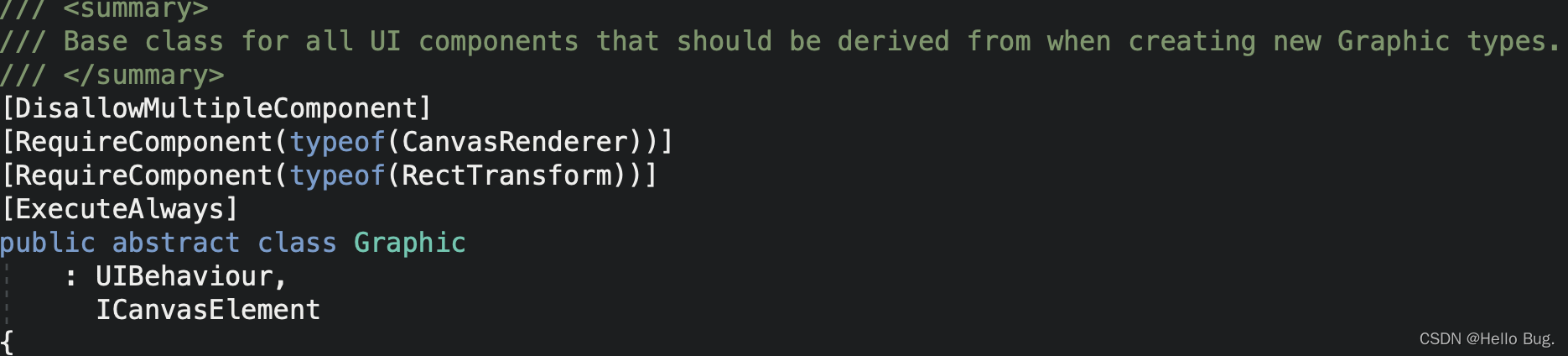 Graphic继承自UIBehaviour和ICanvasElement UIBehaviour是所有UGUI组件的最基类,负责接收来自UnityEngine或者UnityEditor的事件:UGUI源码解析——UIBehaviour ICanvasElement负责接收Canvas重新渲染的事件:UGUI源码解析——CanvasUpdateRegistry Graphic添加了三个特性 ——DisallowMultipleComponent:不允许一个对象添加多个相同的组件 ——RequireComponent:依赖于CanvasRenderer画布渲染组件和RectTransform组件 ——ExecuteAlways:编辑器模式下可以运行 另外Graphic是一个抽象类,意味着不能被实例化,但是它提供了很多可重写的方法可被继承并重写