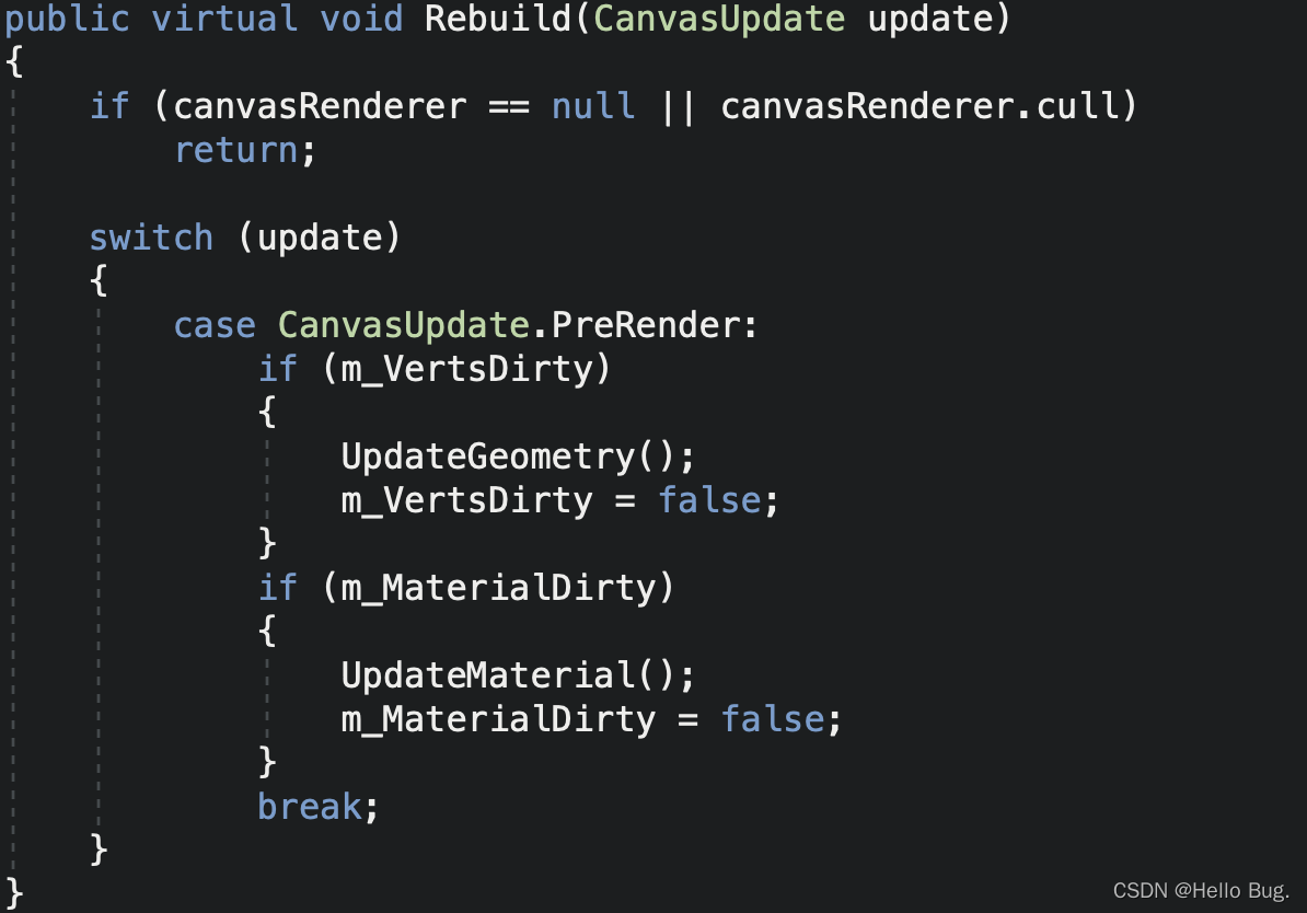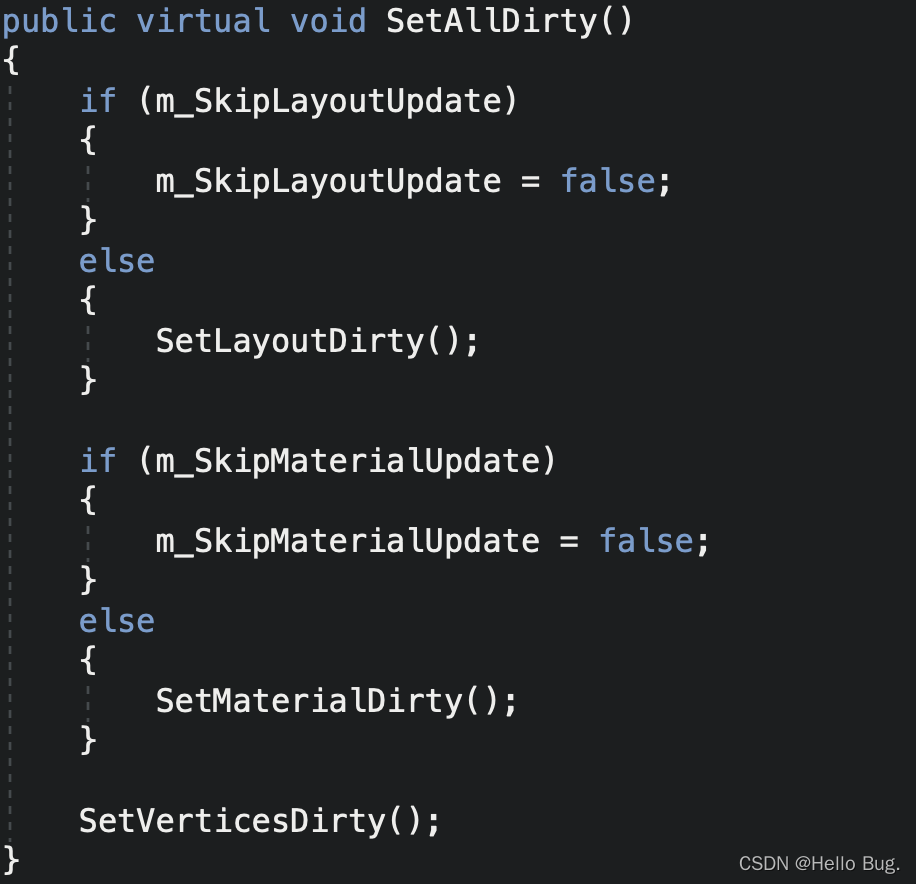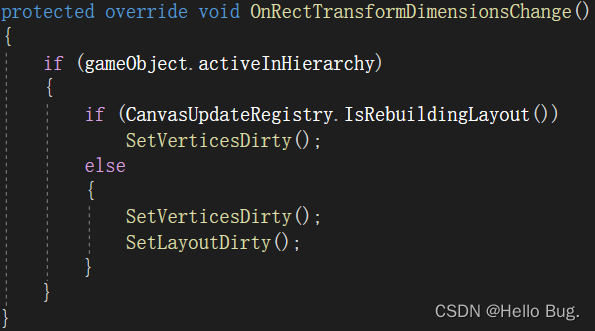 SetLayoutDirty调用了LayoutRebuilder.MarkLayoutForRebuild方法,此方法内部其实是调用了CanvasUpdateRegistry类中的InternalRegisterCanvasElementForLayoutRebuild方法将元素添加到了布局重建的序列中 SetMaterialDirty和SetVerticesDirty调用了CanvasUpdateRegistry.RegisterCanvasElementForGraphicRebuild方法将元素添加到了图像重建的序列中