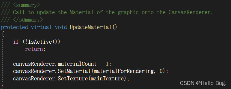 UpdateMaterial方法中首先将自身材质赋值给canvasRenderer(遍历身上继承了IMaterialModifier的组件(例如Mask),然后将贴图赋值给canvasRenderer,这样下一帧canvasRenderer渲染时就会用materialForRendering和mainTexture的数据进行绘制了