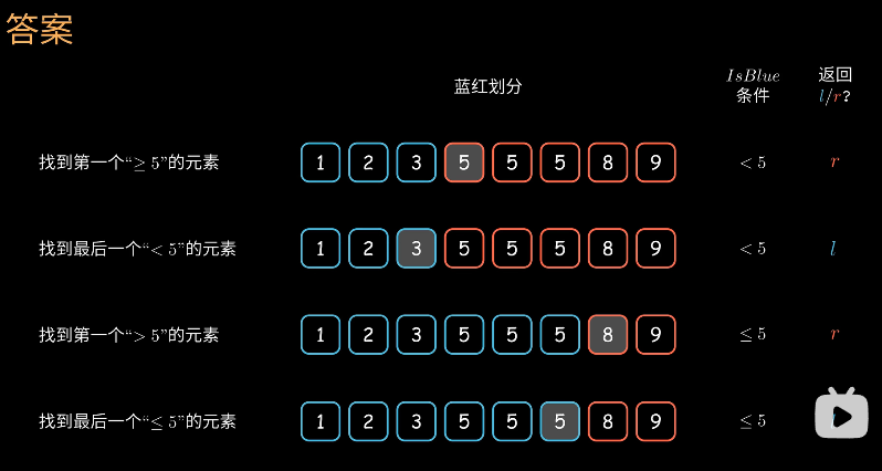 < target ,小于的都是蓝色,大于等于的都是红色,最后返回红色边界,也就是返回 r - 特判:但是这个target有可能在nums数组中不存在,在返回之前还需要判断数组下标为r的值是否等于 target 如果不等于则说明target不在数组中,返回 -1;否则直接返回 r