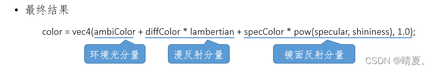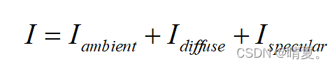 Phong反射模型考虑了光线和材质之间的三种相互作用:环境光反射、漫反射和镜面反射,最终在三维物体表面上的每个点的颜色由这三个成分组合表示如下。